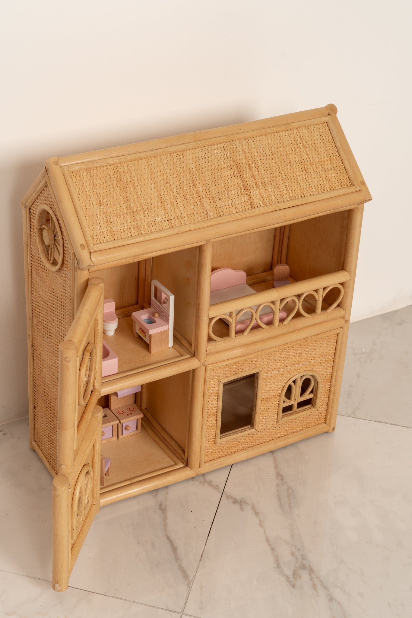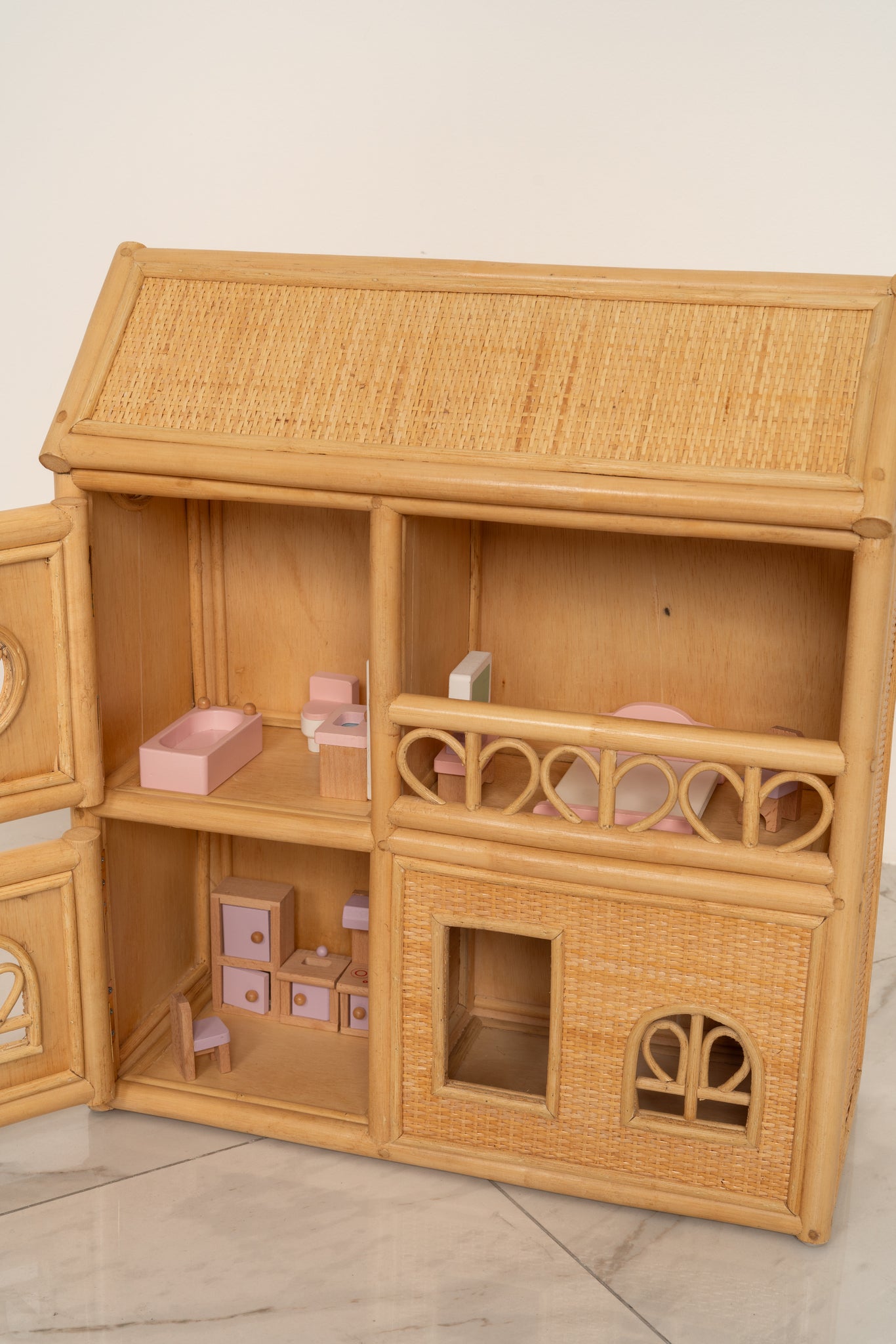 A whimsical three-story abode that invites your miniature friends to play and explore in style. Crafted with intricate rattan detailing and adorned with delightful accents, this dollhouse is the perfect setting for endless imaginative adventures.