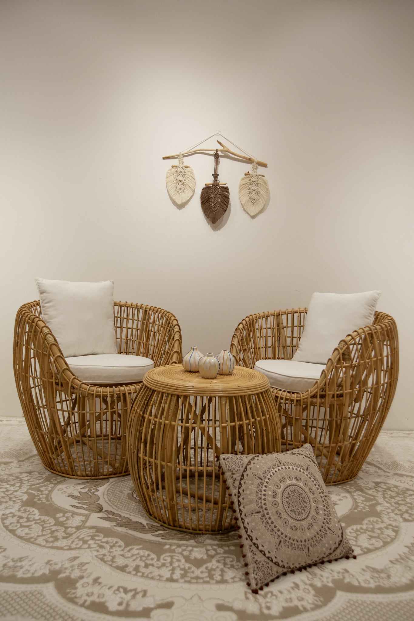 Bohemian-inspired coffee table made from natural rattan, designed to bring a warm, organic feel to your living room or lounge area. It blends rustic charm with functional simplicity, making it ideal as a focal point for social spaces.
