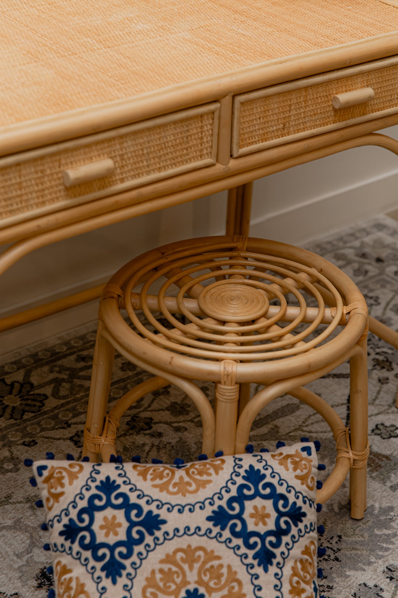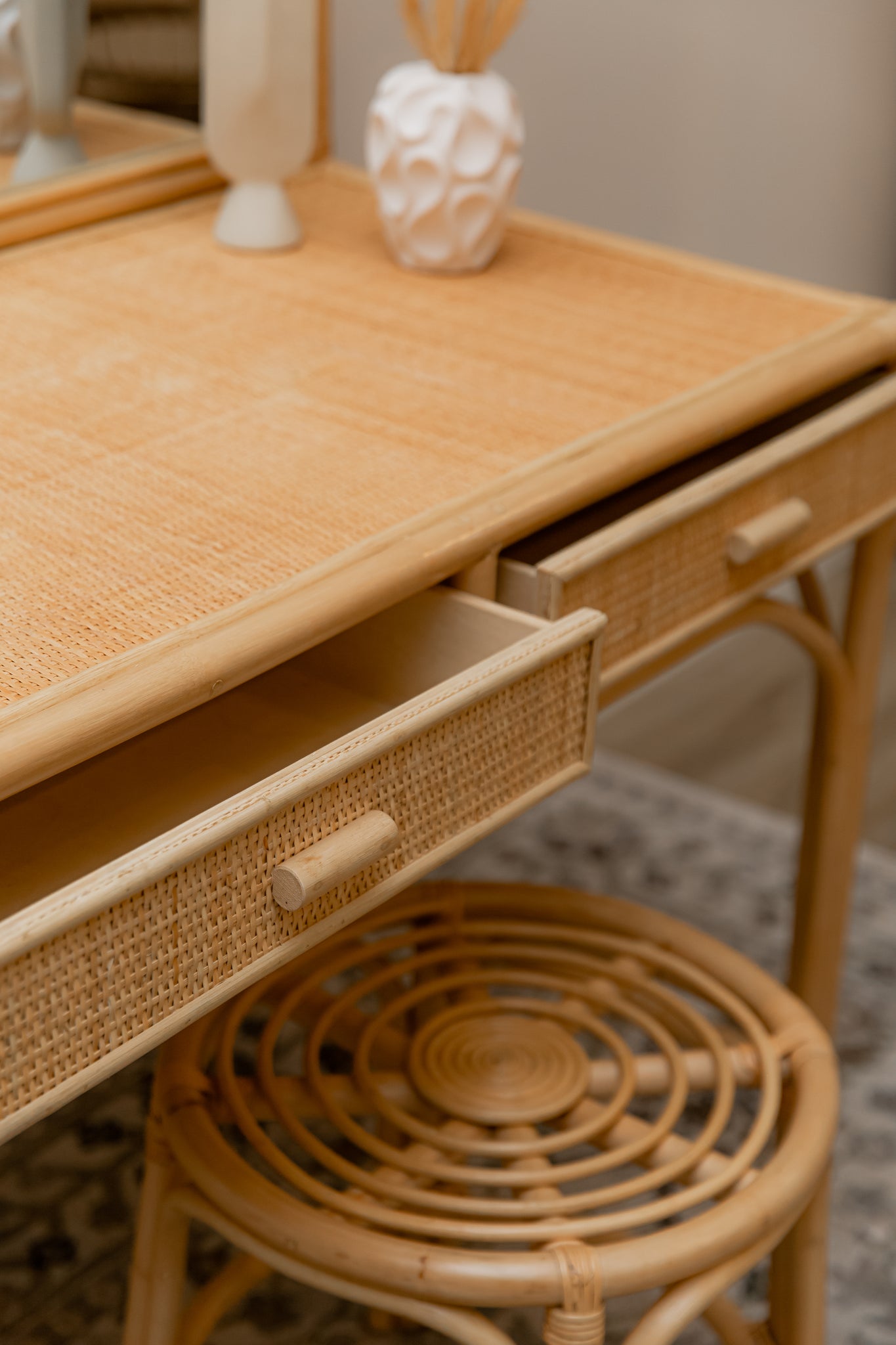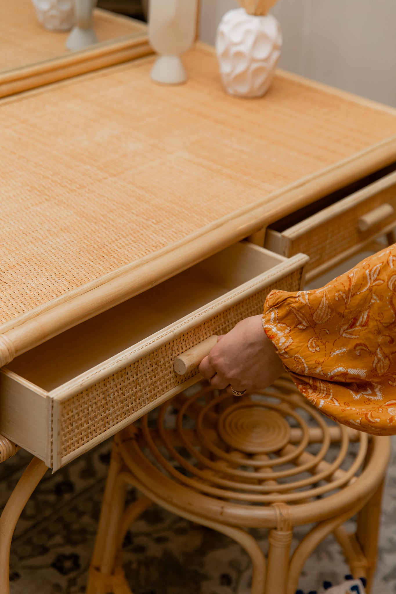 CARE: Wipe clean with a soft, dry, lint-free cloth. Avoid placing rattan furniture in environments with excessive humidity, direct sunlight, and a wet atmosphere.